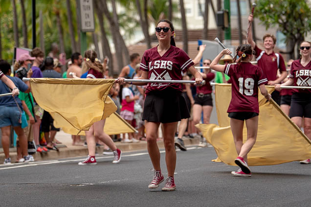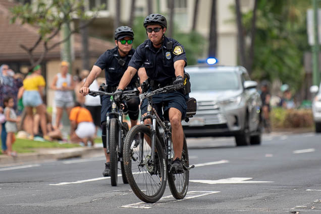 The parade route started in front of the Fort DeRussy area on Kalakaua Avenue. The parade began with personnel from the Honolulu Police Department on both bicycles and on motorcycles, followed by the Grand Marshall and the numerous parade participants. The parade route was mostly west to east on Kalakaua Avenue, and ended at the bandstand area of Kapiolani Park. The photographs in this gallery were taken from the corner of Kalakaua Avenue and Uluniu Avenue, near the Kahanamoku Statue.